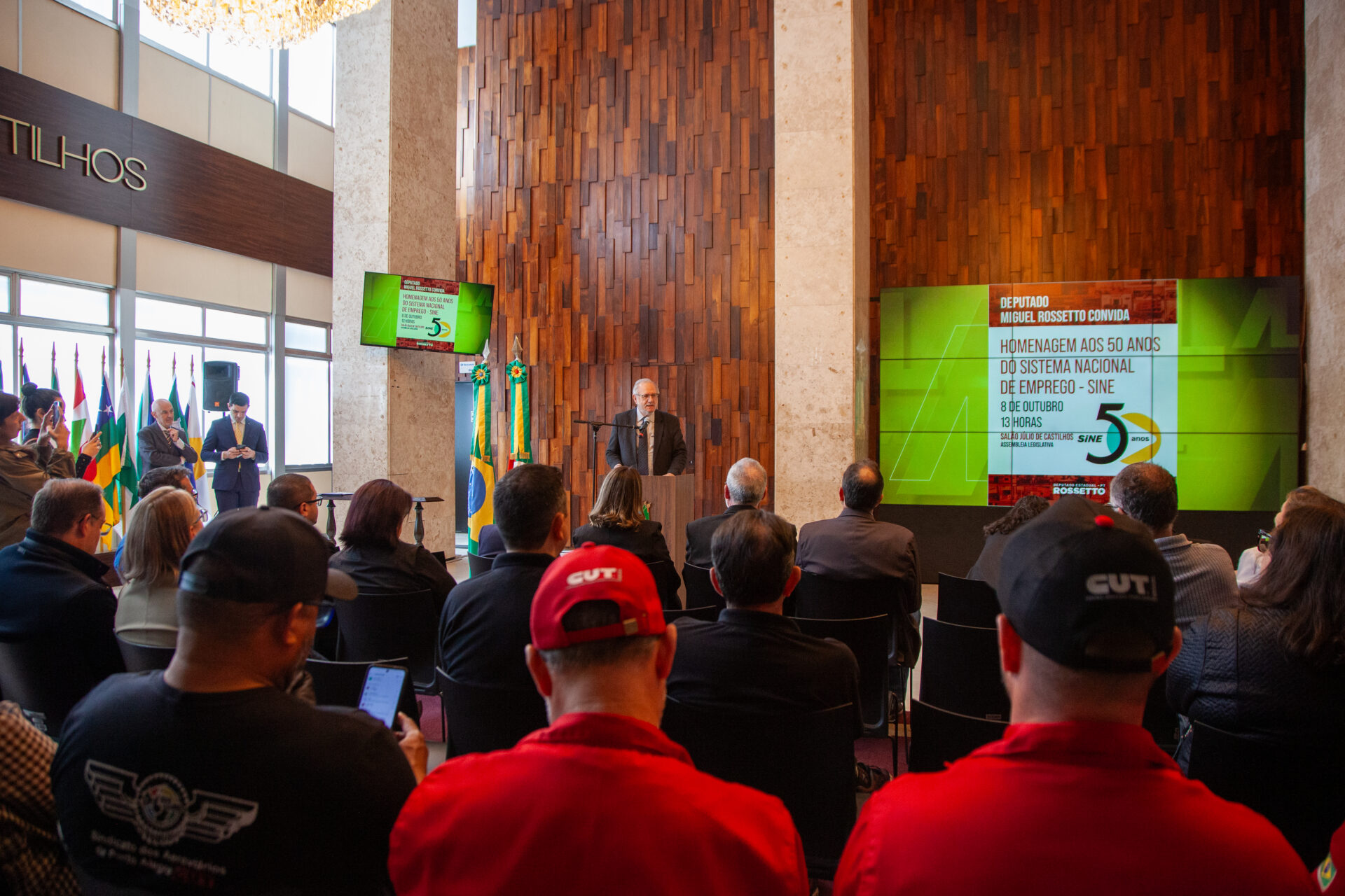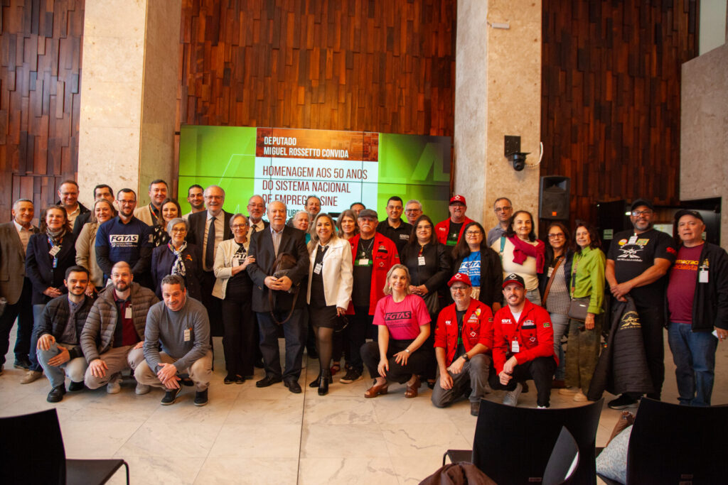 Por proposição do líder da bancada PT/PCdoB, deputado Miguel Rossetto, a Assembleia Legislativa prestou homenagem, nesta quarta-feira (8/10), aos 50 anos do Sistema Nacional de Emprego (SINE). “A ideia de que é o trabalho que produz a riqueza do país, que o trabalho traz dignidade para as pessoas, deve permanentemente ser reafirmada. Imaginar um desempregado que busca o SINE, sai de lá com a carteira assinada e chega em casa com essa notícia. A felicidade do povo. Essa experiência que estamos celebrando aqui”, disse Rossetto na abertura do ato no Salão Júlio de Castilhos.