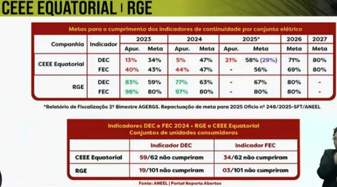 Ao mostrar uma comparação do desempenho da CEEE Equatorial e RGE, Rossetto apontou que a CEEE descumpre as metas de indicadores de qualidade DEC e FEC, que são indicadores utilizados pela Aneel para medir a qualidade do fornecimento de energia elétrica pelas distribuidoras que mostram quanto tempo e quantas vezes a população fica sem luz. E alertou que a CEEE pode perder a concessão se não cumprir, pelo segundo ano, os indicadores de qualidade no Estado. “Gostaria que fossem informadas as razões daquela repactuação que reduz a obrigatoriedade da meta da CEEE Equatorial em relação com total de conjuntos elétricos de 58% para 29% da meta em 2025, o que é revelador da dificuldade da companhia em cumprir com as metas contratadas para o conjunto da concessão”, observou.