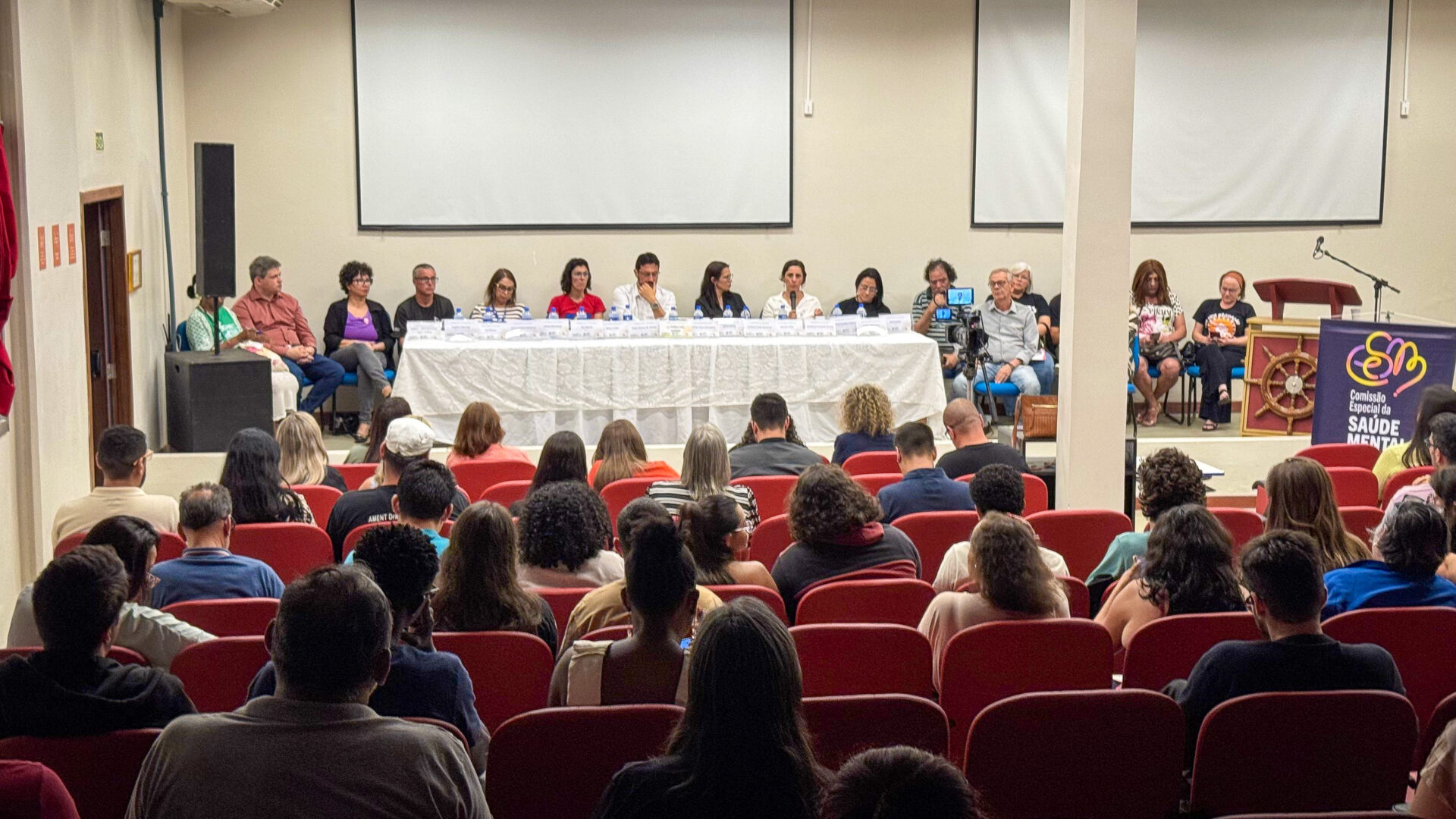 A audiência pública, realizada na noite de quinta-feira (27/11) no auditório do CCMAR da FURG, em Rio Grande, marcou o início dos debates que irão orientar propostas legislativas e ações de fiscalização sobre políticas públicas de prevenção, atendimento e promoção da saúde mental. O encontro reuniu gestores públicos, especialistas, instituições acadêmicas, entidades sindicais, movimentos sociais e representantes estudantis, incluindo nomes importantes como Ana Furlong Antochevis, do Comitê de Gestão em Saúde Mental da FURG; Juliana Acosta Santorum, da Secretaria Municipal de Saúde de Rio Grande; Patrícia Soria, do Núcleo de Saúde Mental da mesma secretaria; Luciane Prado Kantorski, da Secretaria de Saúde de Pelotas; Suzi Barros, representando o SINTERG; Karina Rocha, vereadora e integrante da coordenação do MNLM; além de representantes da Fiocruz, CPERS, UNEGRO, DCE FURG, APTAFURG e APROFURG. A diversidade dos participantes reforçou o caráter coletivo e plural da construção das políticas debatidas.